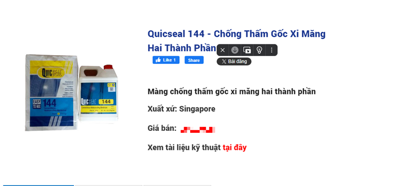 Quicseal 144 là sản phẩm màng chống thấm xi măng dẻo hai thành phần bao gồm nhựa tổng hợp pha trộn với hỗn hợp xi măng được chọn lọc và các chất phụ gia cao cấp khác.