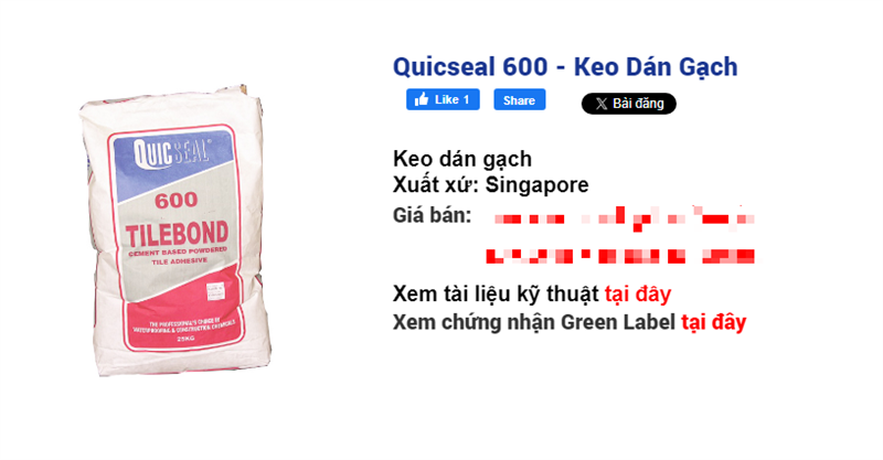 QUICSEAL 600 TILE BOND là chất kết dính dạng bột màu trắng và xám bao gồm xi măng, cát sạch chọn lọc, nhựa tổng hợp và phụ gia có công thức đặc biệt để trộn với nước như là 1 lớp keo dán gạch mỏng có cường độ bám dính rất cao.